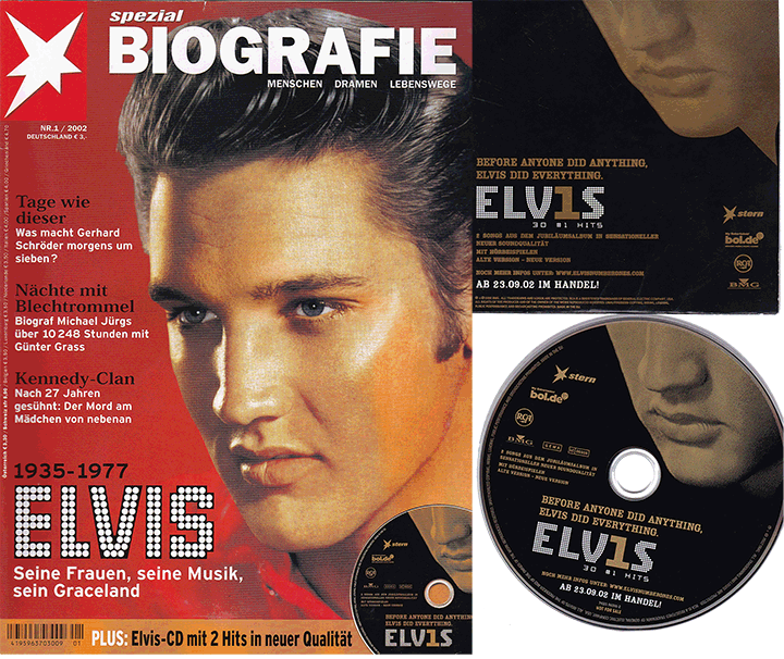 COMMENTS On August 16, 2002, the German weekly STERN published a new magazine - SPEZIAL BIOGRAFIE which included a 4 track BMG CD sampler/ magazine was only issued to promote the 30 # 1 HITS CD. As the main theme in a 52-page article the magazine portrays Elvis - his dreams and wishes - and decribes why listening to Elvis music is still so popular - and finally what Elvis would have done today, had he lived.